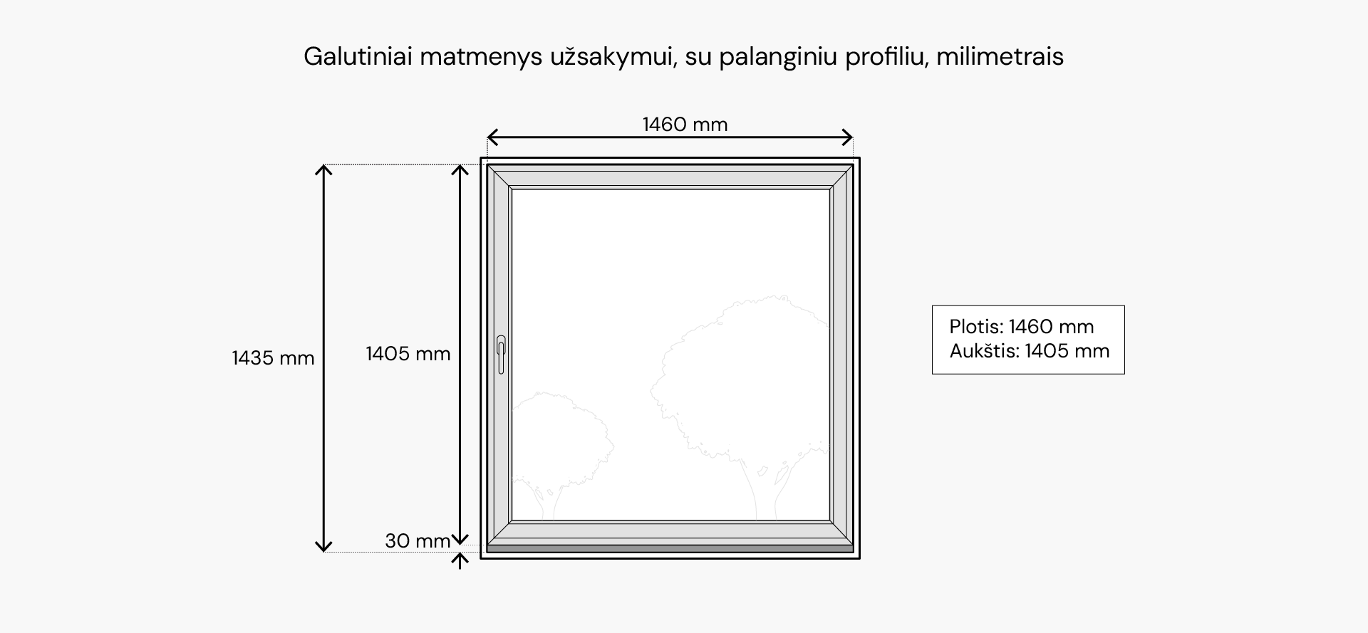 Užsakant langą be palanginio profilio: pagal matavimų pavyzdį, užsakomo produkto plotis: 1460 mm, o aukštis: 1435 mm