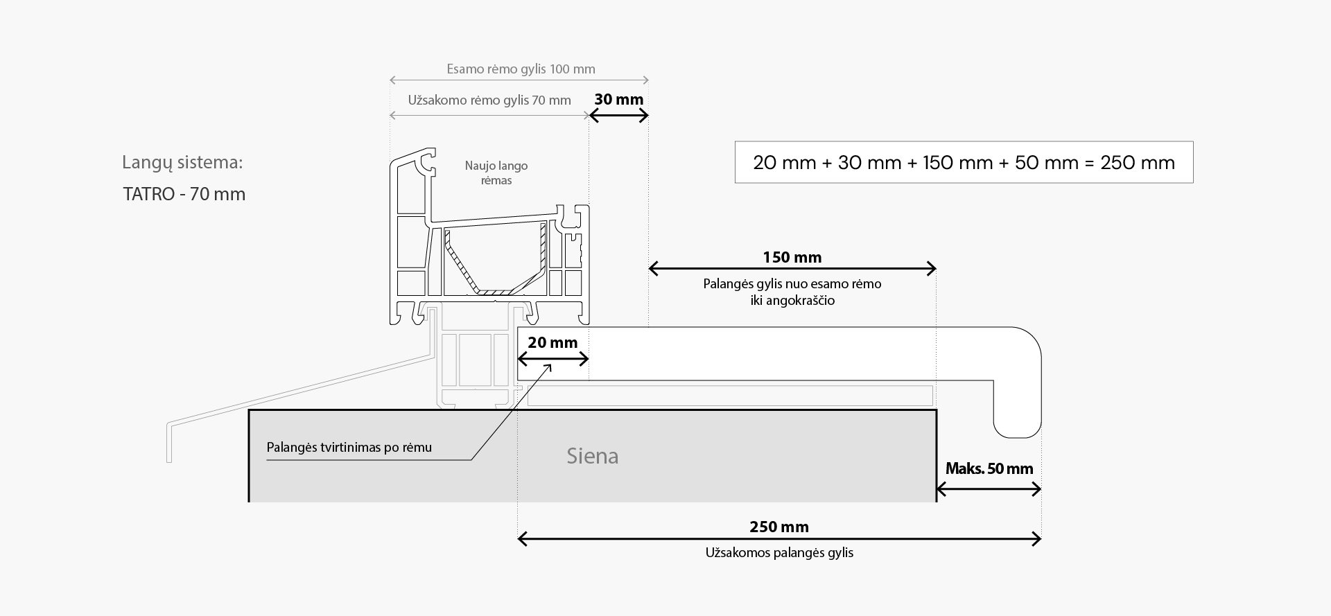 - 20 mm – atstumas palangės tvirtinimui po (TATRO sistemos) rėmu;