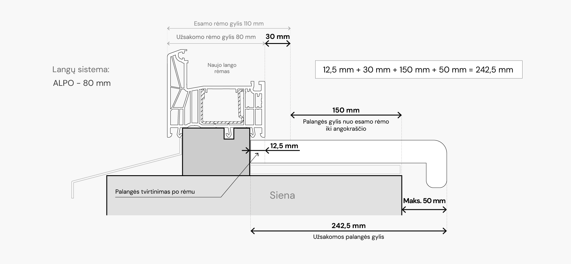 Sudėkite šiuos matmenis (žr. pav. žemiau): A mm (norimas palangės gylis) + 12,5 mm (palangės tvirtinimui po rėmu) = X mm (palangės gylis užsakymui):