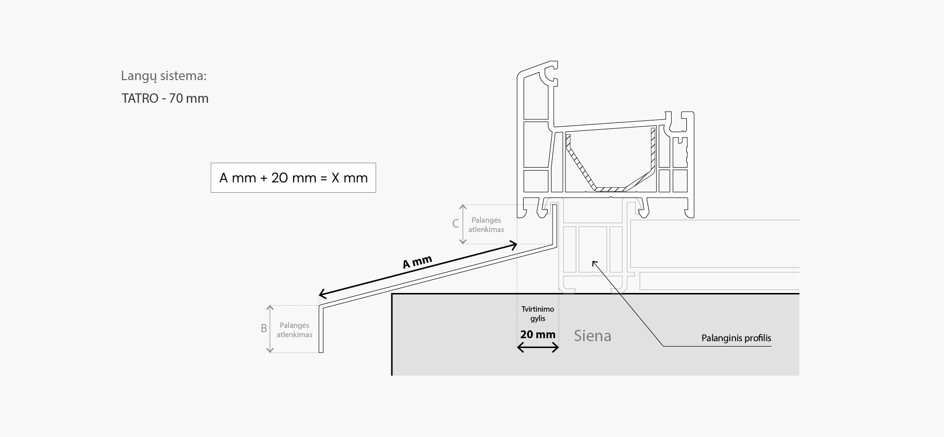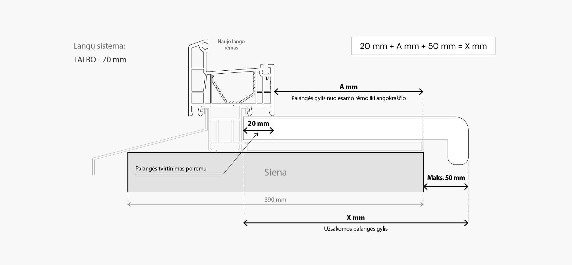 Sudėkite šiuos matmenis (žr. pav. žemiau): A mm (norimas palangės gylis) + 20 mm (palangės tvirtinimui po rėmu) = X mm (palangės gylis užsakymui):