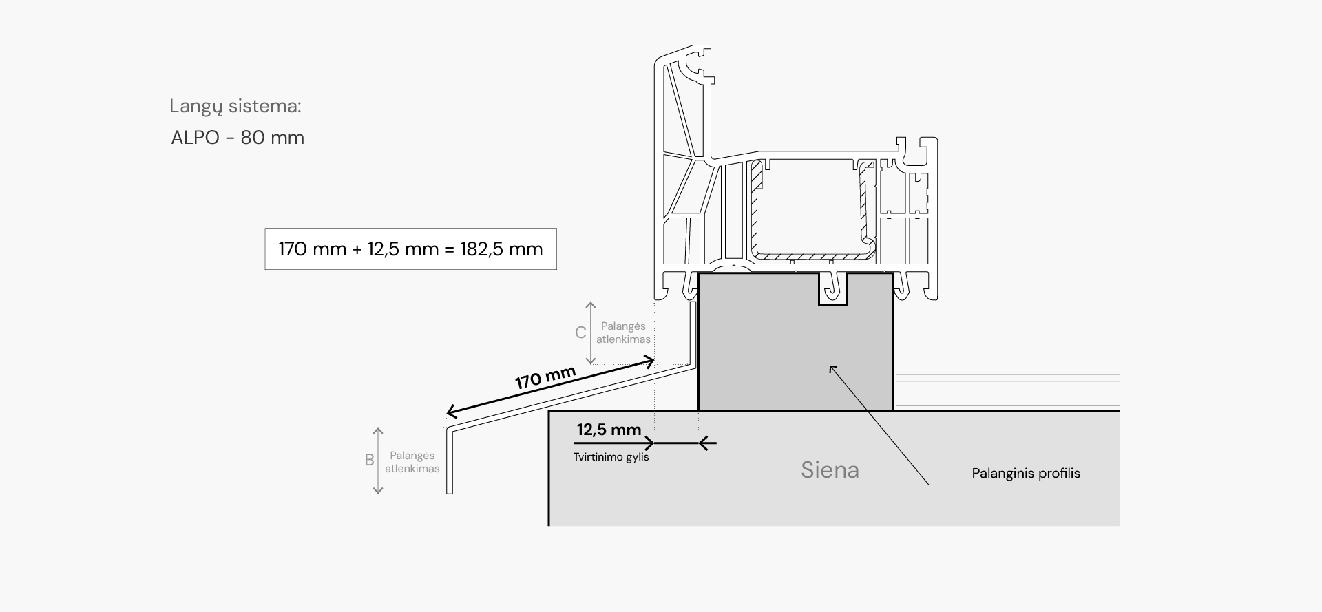 - 12,5 mm – atstumas palangės tvirtinimui prie (ALPO sistemos) palanginio profilio.