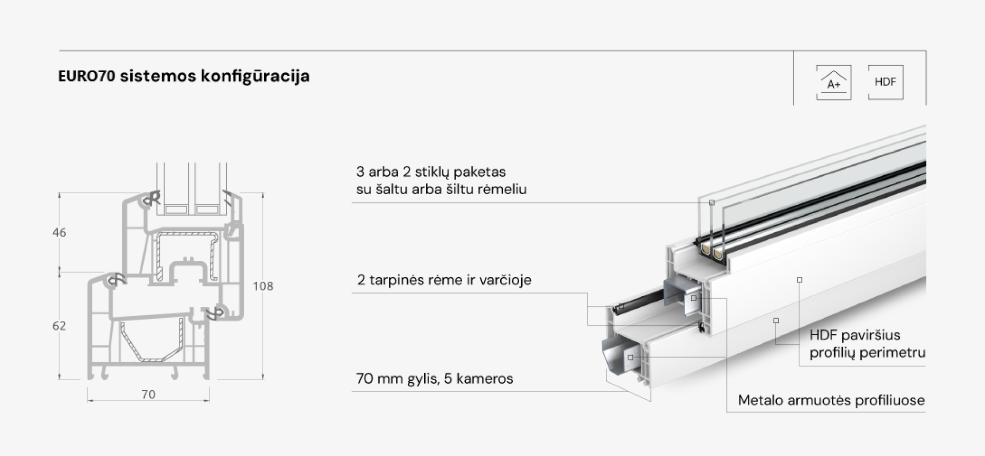 EURO 70 sistemai naudojami REHAU profiliai. Tai 5 kamerų, 70 mm gylio, 2 tarpinių, gan aukštus sandarumo parametrus turinti plastiko (PVC) sistema. Tai - tinkamiausias pasirinkimas tiems, kas ieško ekonomiškų sprendimų, nekelia aukščiausių energinio efektyvumo reikalavimų ir nepageidauja didesnių gabaritų. Su šia sistema galima pasiekti A+ energinio naudingumo klasę (Uw- 0,82²).