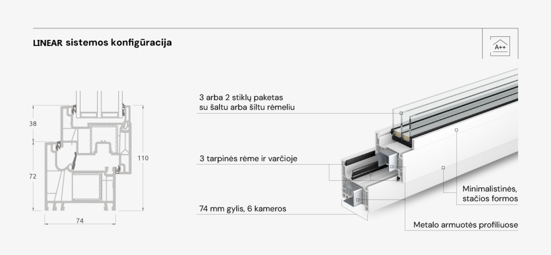 LINEAR sistemai naudojami GEALAN plastiko (PVC) profiliai: 6 kamerų, 74 mm gylio, su 3 tarpinėmis, pasižymintys itin aukštu energiniu efektyvumu, turintys aukštus sandarumo parametrus.