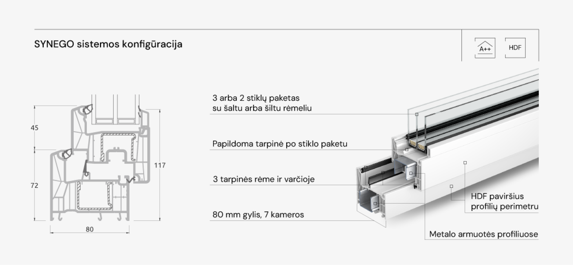 SYNEGO sistemai naudojami REHAU profilai. Tai 7 kamerų, 80 mm gylio, 3 tarpinių plastiko (PVC) sistema, pasižyminti aukštu energiniu efektyvumu ir aukštais sandarumo parametrais. Su šia sistema galima viršyti aukščiausiai A++ energinio naudingumo klasei keliamus šiluminio laidumo reikalavimus (Uw – 0,71²) bei atitikti pasyvaus namo standartą.
